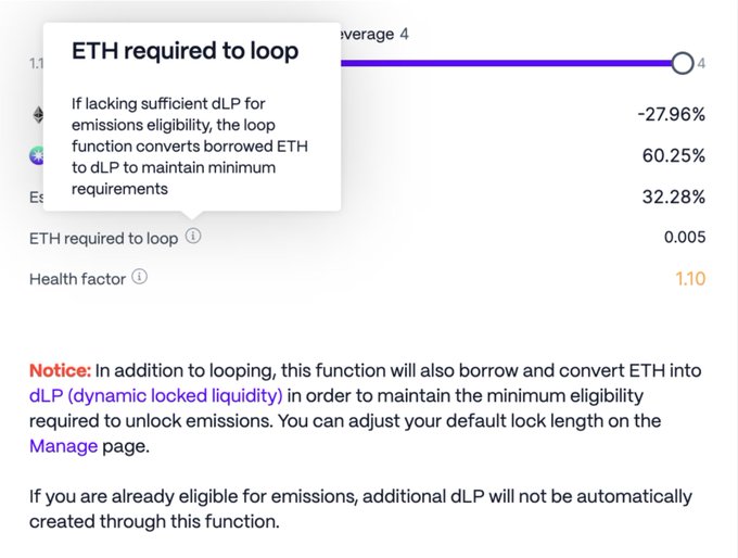 具体为你需要相当于存款金额 5%的 dLP, dLP 即为一个 80%RDNT/20%ETH 的 Balancer 池子的LP,一旦比例小于5%,那么你就拿不到 RDNT 排放收益了。 如果你使用了 RDNT 的一键 loop 功能,一旦你的 dLP 占比不足 5%,系统将自动帮你借钱买dLP。
