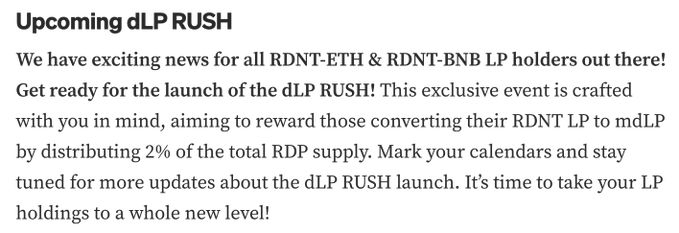 短线套利式的参与方式,通过币安抵押借入 RDNT 或者做空合约对冲,参与 mDLP Rush 活动将DLP 转化为mDLP ,一边拿 RDP 空投,另一边拿 IDO 份额。 如果你对基础层代币(RDNT)有持有欲望的话,也可以直接买入参与 mDLP Rush。