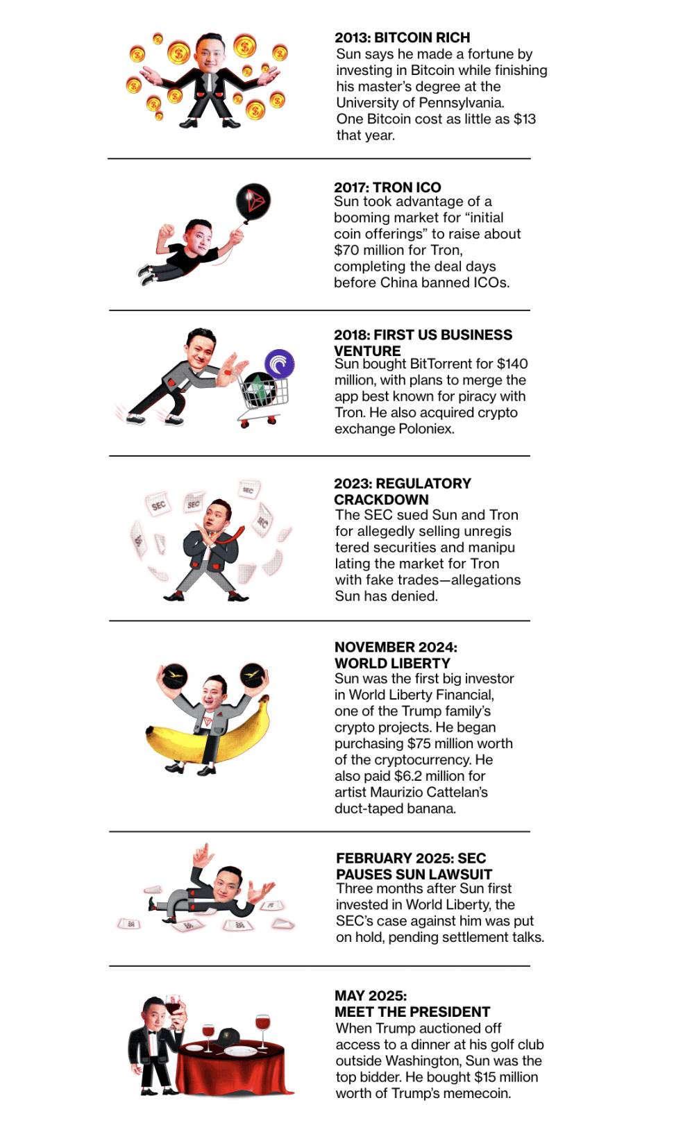 2025 年 6 月,孙宇晨进入美国市场的努力开始见效。多米纳里证券—— 这家小型投资银行将唐纳德・特朗普 Jr.和埃里克・特朗普列为顾问,通过复杂操作,协助孙宇晨将波场推向纳斯达克交易所。据《彭博亿万富翁指数》估算,这一操作可为孙宇晨带来约 10 亿美元收入(特朗普兄弟未回应置评请求;埃里克否认参与该项目,但承认孙宇晨是朋友)。