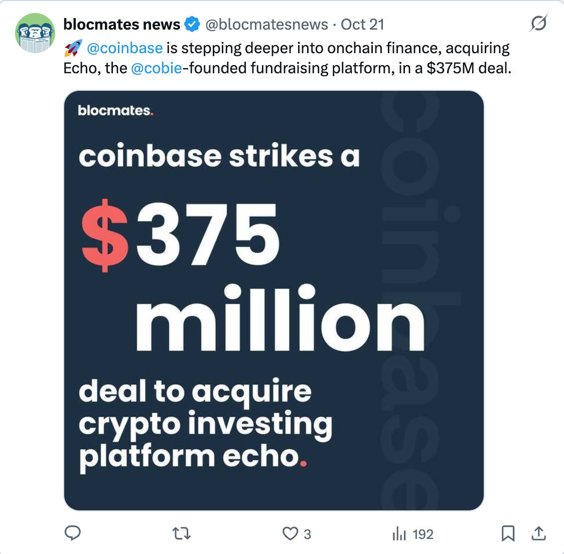 上个月,加密领域发生了一宗堪称史上最大规模的收购案之一:Coinbase 以 3.75 亿美元收购了链上资本募集平台 @echodotxyz。这项收购还包括 Echo 的产品 Sonar,这是一款允许任何人发起公开代币销售的工具。
