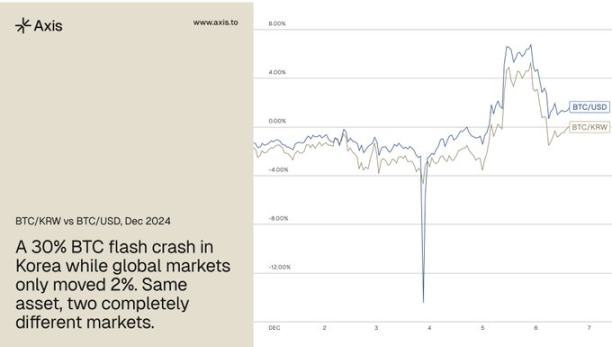 The clearest documentation occurred on December 3, 2024, when President Yoon Suk Yeol declared martial law. Bitcoin’s price in South Korea fell roughly 30% intraday, while the global price dropped only ~2%—a 28-percentage-point divergence fully attributable to domestic political shock. Total sell-off volume amounted to approximately $33.3 billion, and South Korea briefly recorded the highest trading volume globally—an archetypal example of how such market misalignments unfold.
