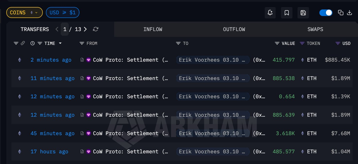 TechFlow News: On March 20, according to on-chain analyst Ai Aunt (@ai_9684xtpa), Erik Voorhees—early Bitcoin supporter and founder of ShapeShift—purchased 5,805.51 ETH on-chain within the past 50 minutes via his associated address 0x102…1e781, at an average price of $2,126.32, spending approximately $12.344 million. Following this purchase, the total ETH holdings of this address have increased to 109,194.73 ETH since March 10, with a current total value of roughly $232 million and an updated average cost basis of $2,162.68.