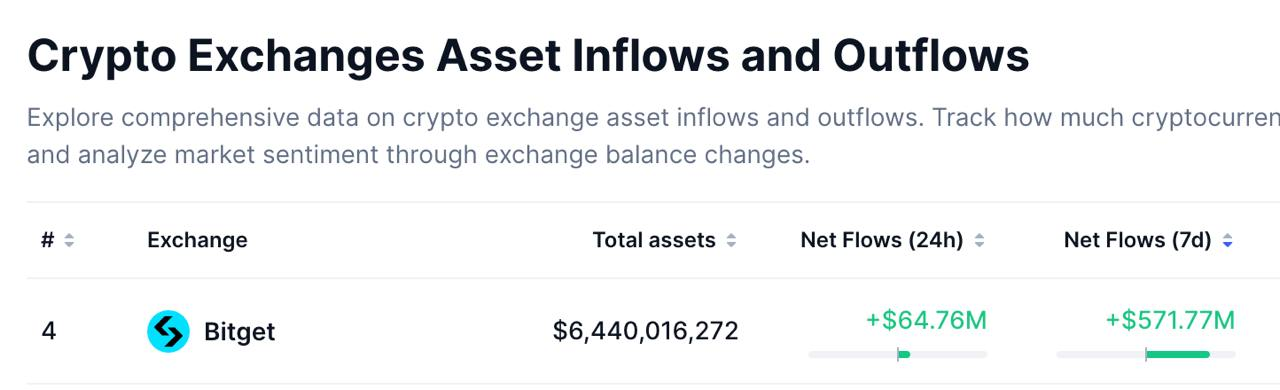 According to CoinMarketCap data, Bitget recorded a net inflow of $571 million over the past seven days, ranking first among global CEXs.