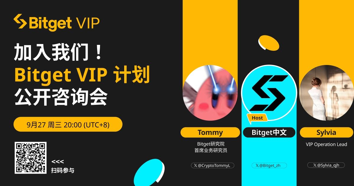 Bitget 将举办主题为 【Bitget 首期VIP计划咨询会】的线上活动,主持嘉宾为 Bitget中文官方,其他嘉宾包括:Bitget VIP Operation Lead Sylvia、Bitget研究院首席业务研究员 Tommy。