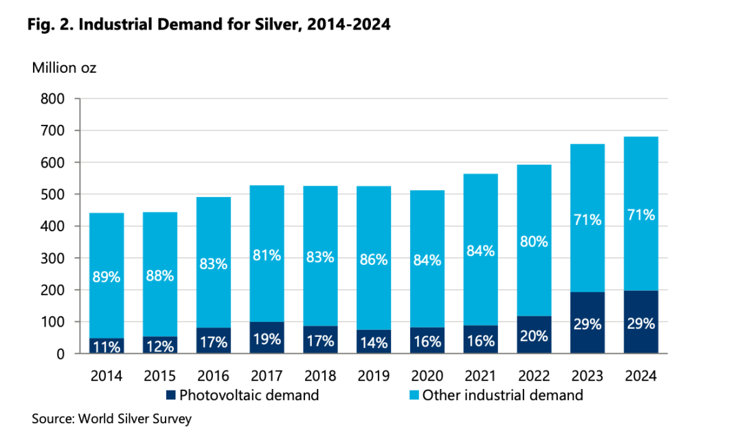 AI 和数据中心。 服务器、芯片封装、高频连接器,白银的导电性和导热性不可替代。这块需求 2024 年开始加速,Silver Institute 专门在报告里单列了"AI 相关应用"。
