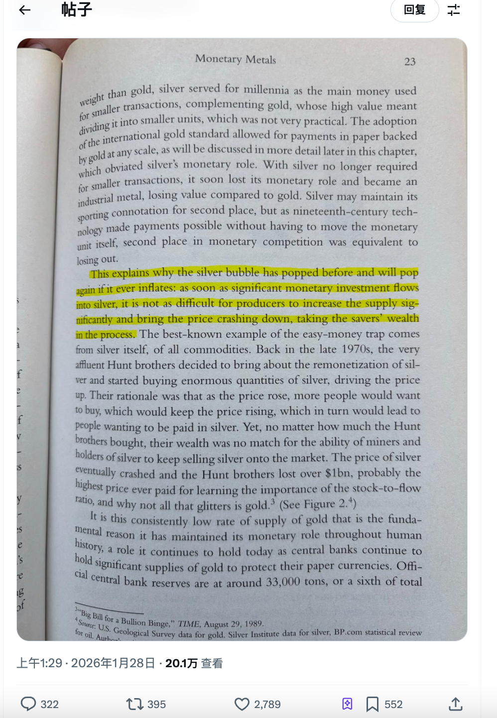 书里那段被高亮的话大意是:白银泡沫破过,以后还会再破。因为一旦大量资金涌入白银,矿商可以轻松增加供应,把价格砸下来,储蓄者的财富跟着蒸发。