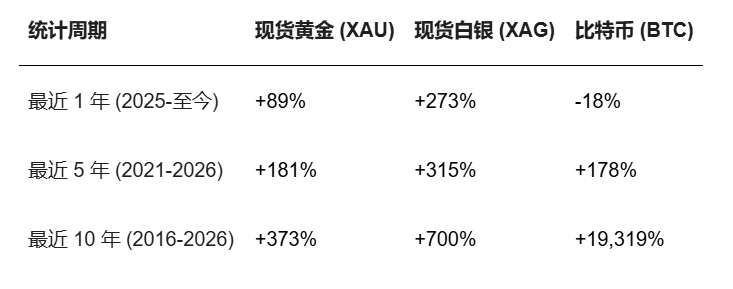 如果从长期视角看,比特币依然是回报最高的资产之一。但放到过去一年,比特币的表现却明显落后于黄金和白银。2025年至2026年初的市场走势呈现出极为鲜明的二元分化特征,贵金属市场步入了一个被称为”超级周期”的阶段,而比特币略显颓势。下面是三个关键周期的对比数据: