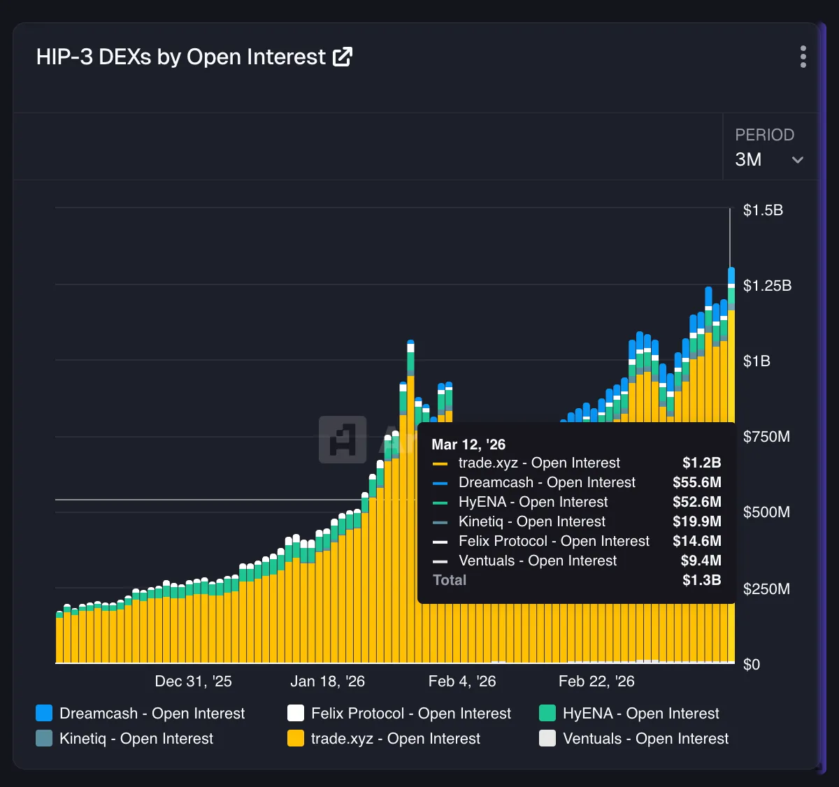 HIP-3 市场本周未平仓合约(OI)再创新高:3 月 12 日,总 OI 达到约 13 亿美元。其中 trade.xyz 一家平台贡献了约 12 亿美元,Dreamcash 和 HyENA 等小型平台提供了部分增量深度。