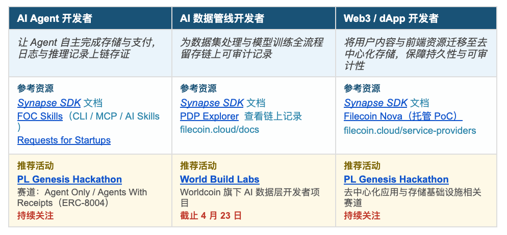 Agent 原生支付 支持 AI Agent 通过 Synapse SDK 直接管理钱包与存储流程,无需人工参与,兼容 ERC-8004 跨 Agent 互操作标准。