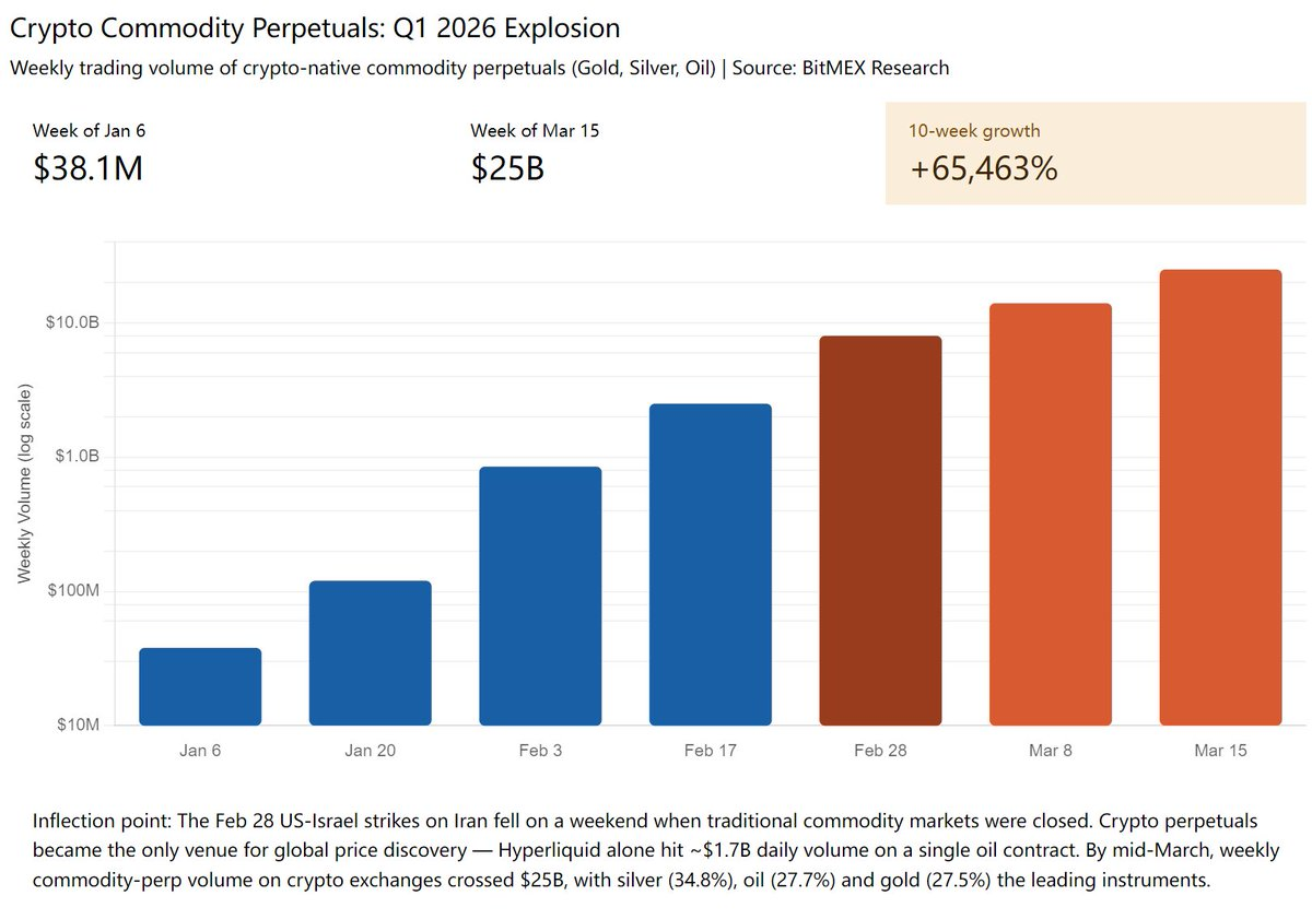 导语:2026年Q1,加密交易所的商品类永续合约(黄金、白银、原油)周交易量从$38.1M飙升至$25B,增长65,463%。传统资产代币化将是Crypto接下来5-10年的主线,而Pre-IPO代币化,只是这股浪潮中,最新加入战场的一个品类。
