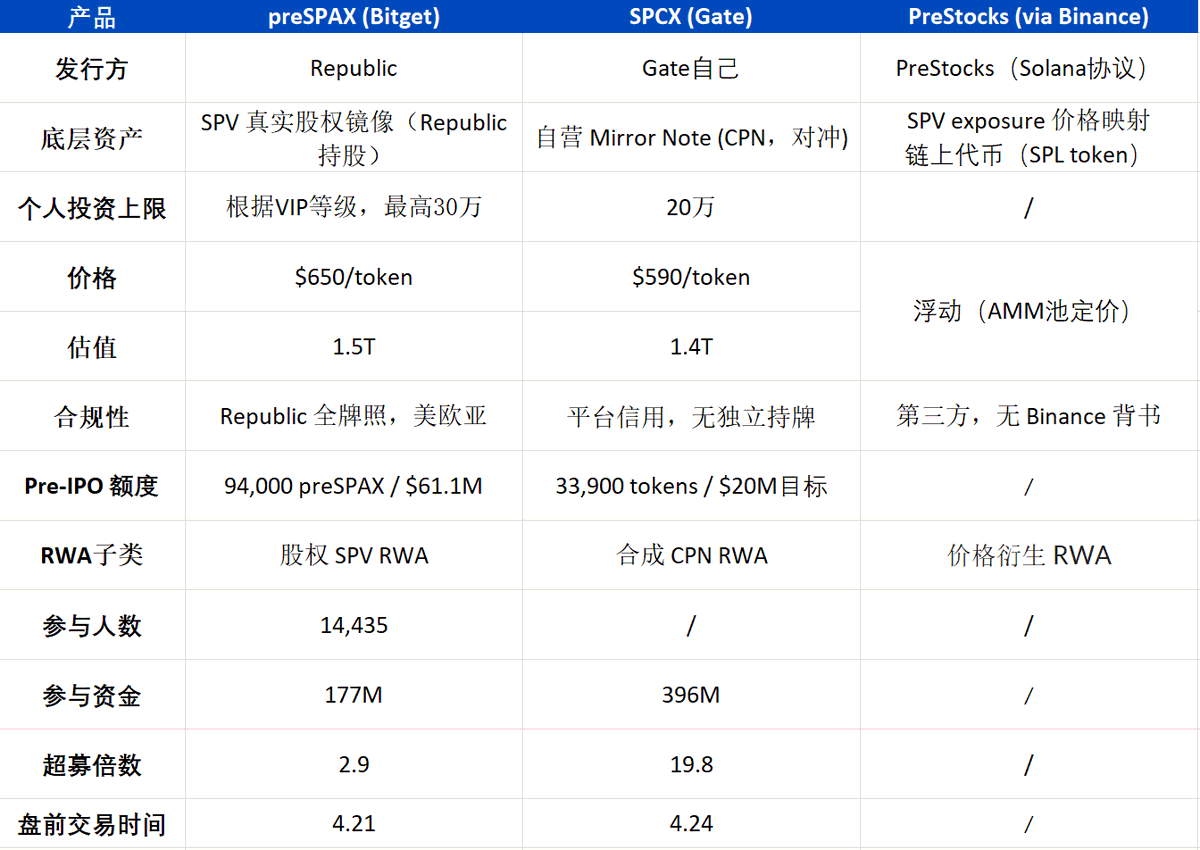 4月,Bitget、Gate、Binance(PreStocks)三家头部交易所几乎同时上线了SpaceX相关的代币化产品。合规方式各有区别,但其本质都是,将过去仅面对超高净值客户的pre-IPO市场份额,拆成碎片卖给散户。