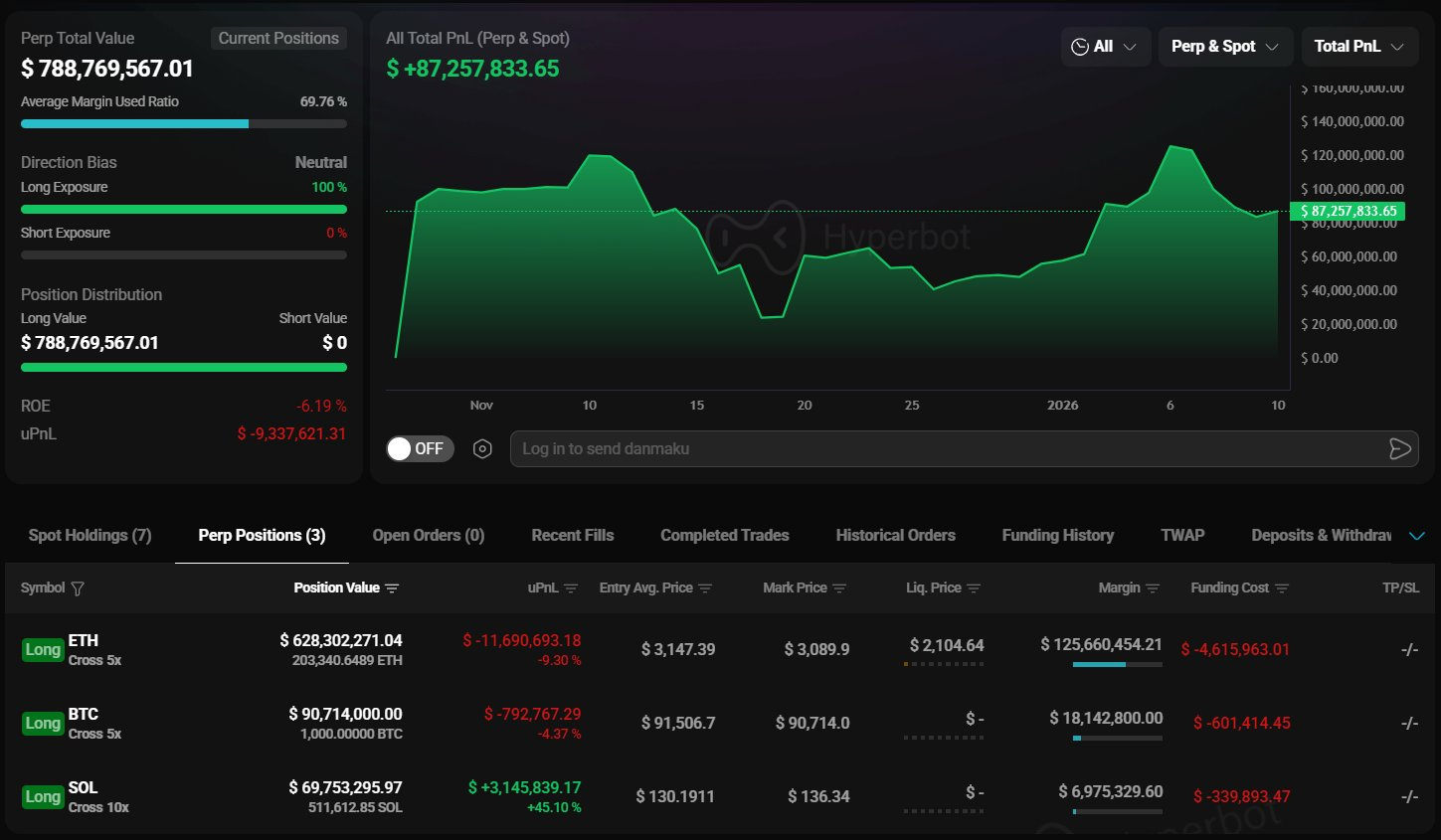 深潮 TechFlow 消息,1 月 10 日,据 Onchain Lens(@OnchainLens)监测,随着市场持续下行,一位比特币"OG"(10/11)持有的多头头寸目前浮亏超过 900 万美元,并在资金费用上损失了 556 万美元。该投资者的比特币(BTC)和以太坊(ETH)头寸均处于亏损状态,而 SOL 头寸仍保持盈利。