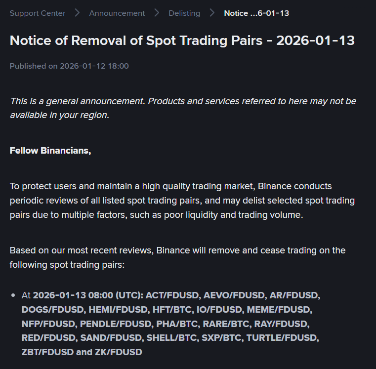 深潮 TechFlow 消息,1 月 12 日,据官方公告,币安将于2026年1月13日16:00(北京时间)下架ACT/FDUSD、AEVO/FDUSD、AR/FDUSD、DOGS/FDUSD、HEMI/FDUSD、HFT/BTC、IO/FDUSD、MEME/FDUSD、NFP/FDUSD、PENDLE/FDUSD、PHA/BTC、RARE/BTC、RAY/FDUSD、RED/FDUSD、SAND/FDUSD、SHELL/BTC、SXP/BTC、TURTLE/FDUSD、ZBT/FDUSD 和 ZK/FDUSD 20组现货交易对。相关币种本身仍可在其他交易对中交易。受影响交易对的现货交易机器人服务也将同时终止,用户需及时取消以避免潜在损失。