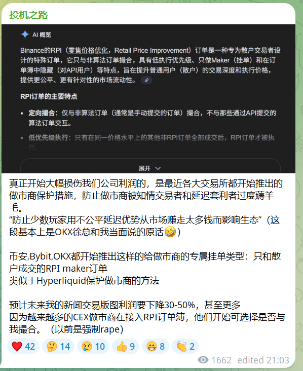 因为越来越多的CEX做市商在接入RPI订单簿,他们开始可选择是否与我撮合。”