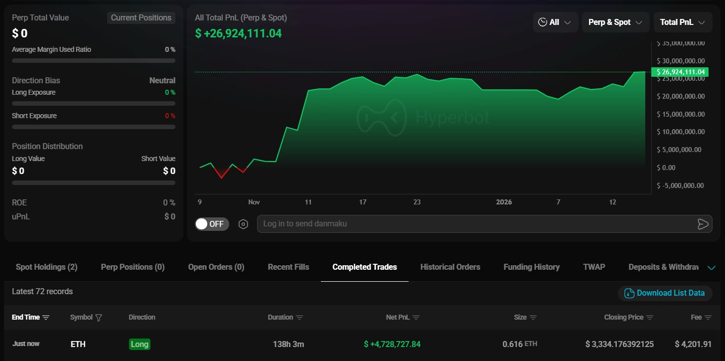 深潮 TechFlow 消息,1 月 14 日,据 Onchain Lens(@OnchainLens)监测,鲸鱼地址"pension-usdt.eth"已完全平仓其以太坊(ETH)3 倍杠杆多头头寸,本次交易获利 472 万美元。该地址累计已实现约 2700 万美元的交易利润。