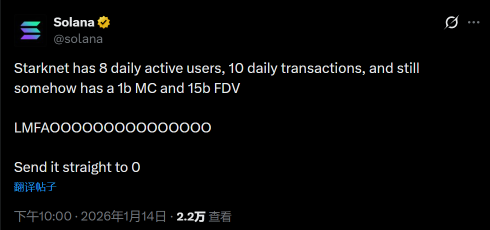 深潮 TechFlow 消息,1 月 14 日,Solana 官方 X 账号发文“炮轰” Starknet:“Starknet 目前日活跃用户仅有 8 人,日交易量仅 10 笔,但其市值仍达 10 亿美元,完全稀释市值(FDV)高达 150 亿美元。”