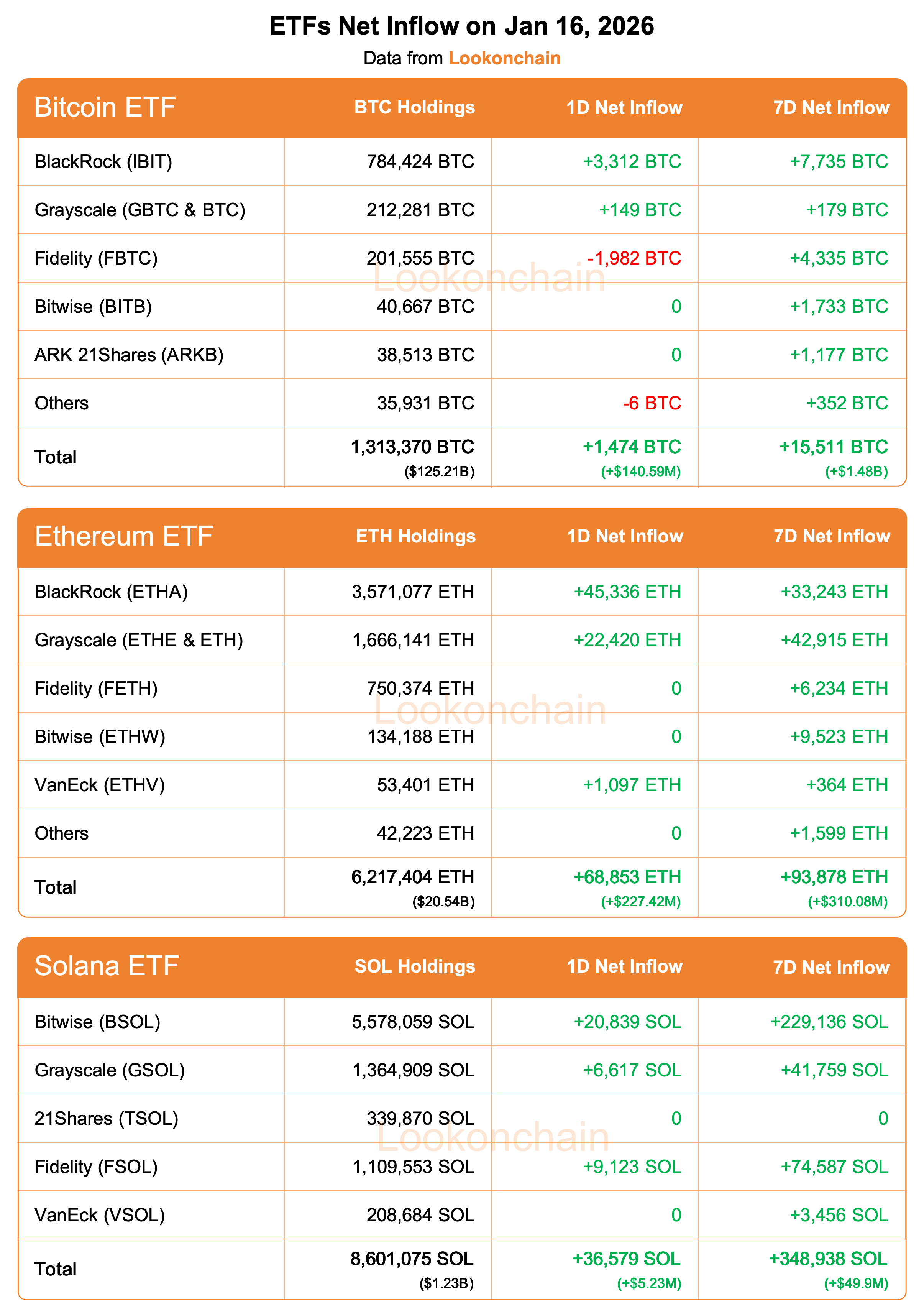 深潮 TechFlow 消息,1 月 16 日,据 Lookonchain 监测,截止于发稿,今日 10 只比特币 ETF 净流入 1,474 枚 BTC(价值 1.4059 亿美元),9 只以太坊 ETF 净流入 68,853 枚 ETH(价值 2.2742 亿美元),SOL ETF 净流入 36,579 枚 SOL(价值 523 万美元)。