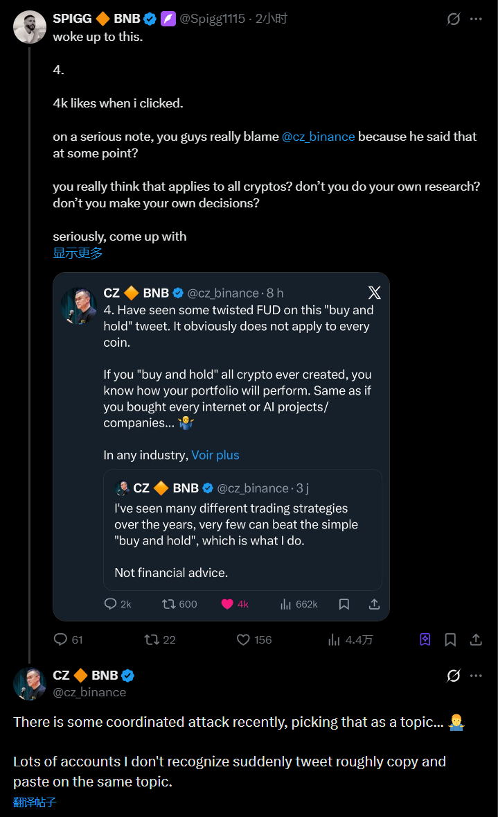 币安创始人赵长鹏(CZ)在社交媒体平台上发文表示,近期出现一些针对他的有组织的攻击行为。他指出:"最近有一些协同攻击,选择"买入并持有"话题作为目标...许多我不认识的账号突然发布几乎相同的复制粘贴内容。" 此前的推文中,赵长鹏曾表示他个人采用"买入并持有"的简单策略,但指出这并不适用于所有加密货币项目,也不构成财务建议。