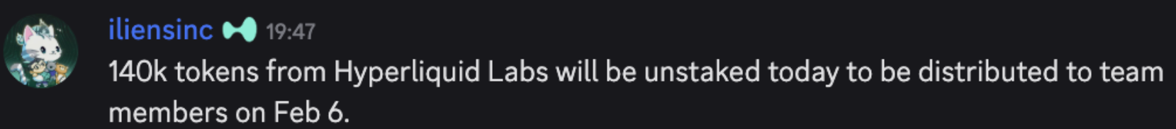 据 Hyperliquid Discord 消息,Hyperliquid Labs 将于今日解锁 14 万枚代币,这些代币计划于 2 月 6 日分配给团队成员,约合 462 万美元。