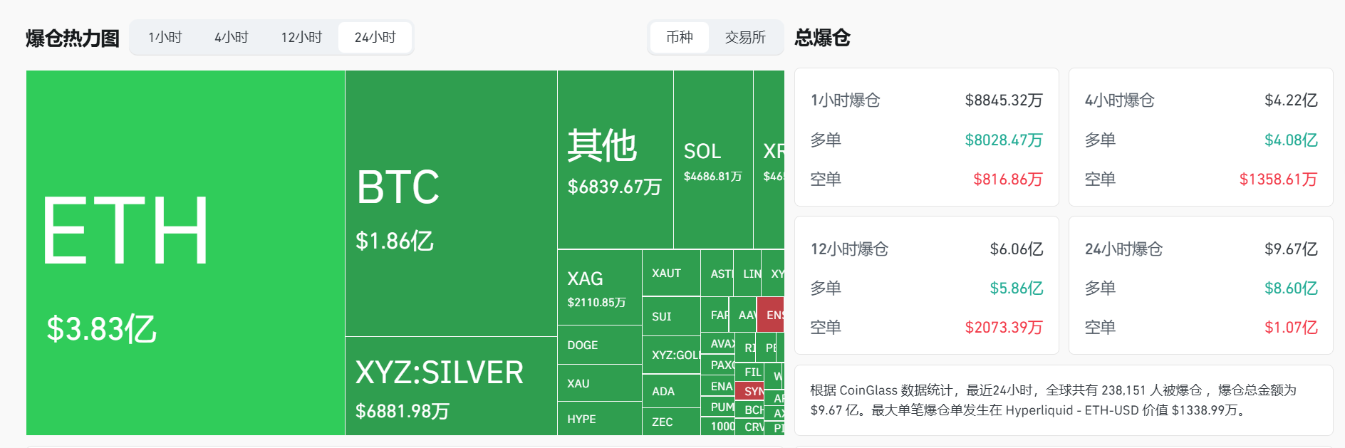 据 CoinGlass 数据,过去 24 小时内加密货币市场总爆仓金额达 9.67 亿美元,其中,多单爆仓 8.60 亿美元,空单爆仓 1.07 亿美元。 BTC 爆仓金额达 1.86 亿美元,ETH 爆仓 3.83 亿美元。过去 24 小时内共有 238,151 人被爆仓,最大单笔爆仓出现在 Hyperliquid 的 ETH-USD 交易对上,价值 1338.99 万美元。