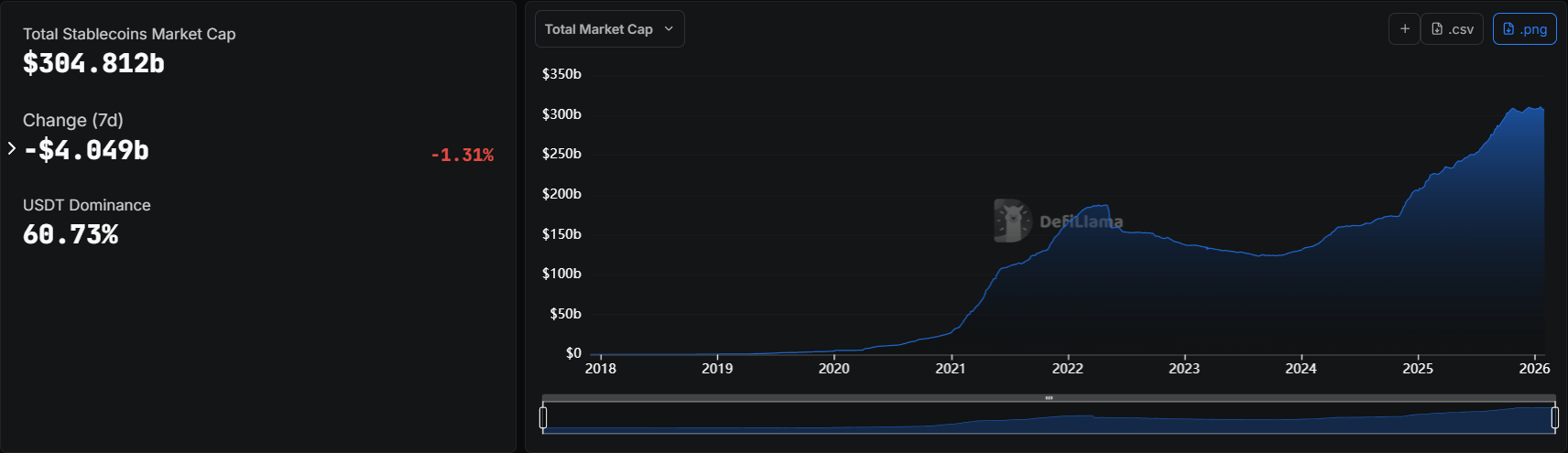 深潮 TechFlow 消息,2 月 2 日,据 DeFiLlama 数据,目前加密市场稳定币总市值为 3048.12 亿美元,较上周减少了 40.49 亿美元,环比下降 1.31%,其中 USDT 市值占比率为 60.73%。