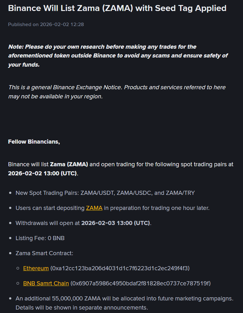 币安将上线 Zama(ZAMA) 并为其添加种子标签