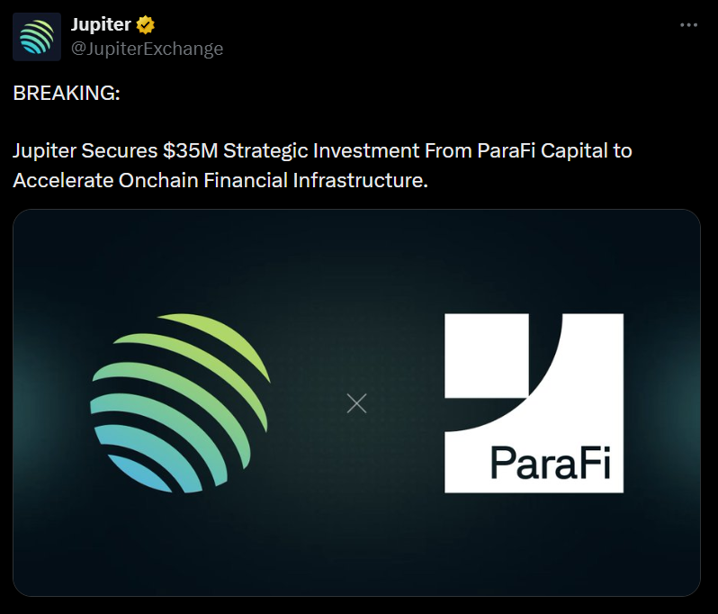 据 Jupiter 官方消息,已获得 ParaFi Capital 3500 万美元战略投资,旨在加速链上金融基础设施的发展。