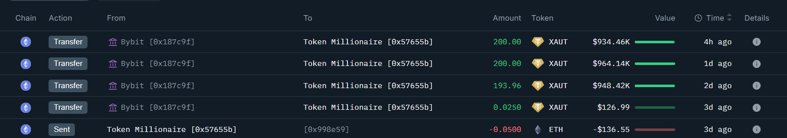 深潮 TechFlow 消息,2 月 2 日,据 Onchain Lens(@OnchainLens)监测,一沉寂 8 个月的鲸鱼地址在过去 3 天内从 Bybit 交易所提取了 593.98 枚泰达金币(XAUT),价值约 278 万美元。