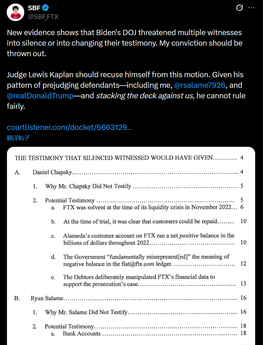 SBF X 账号发文表示,有新证据表明拜登政府司法部威胁多名证人保持沉默或更改证词,因此他的定罪应被撤销。SBF 同时要求法官 Lewis Kaplan 回避相关动议,称该法官对包括他本人、前 FTX 高管 Ryan Salame 和总统特朗普在内的被告都存在预判倾向,并对他们"设置障碍",无法公正裁决。