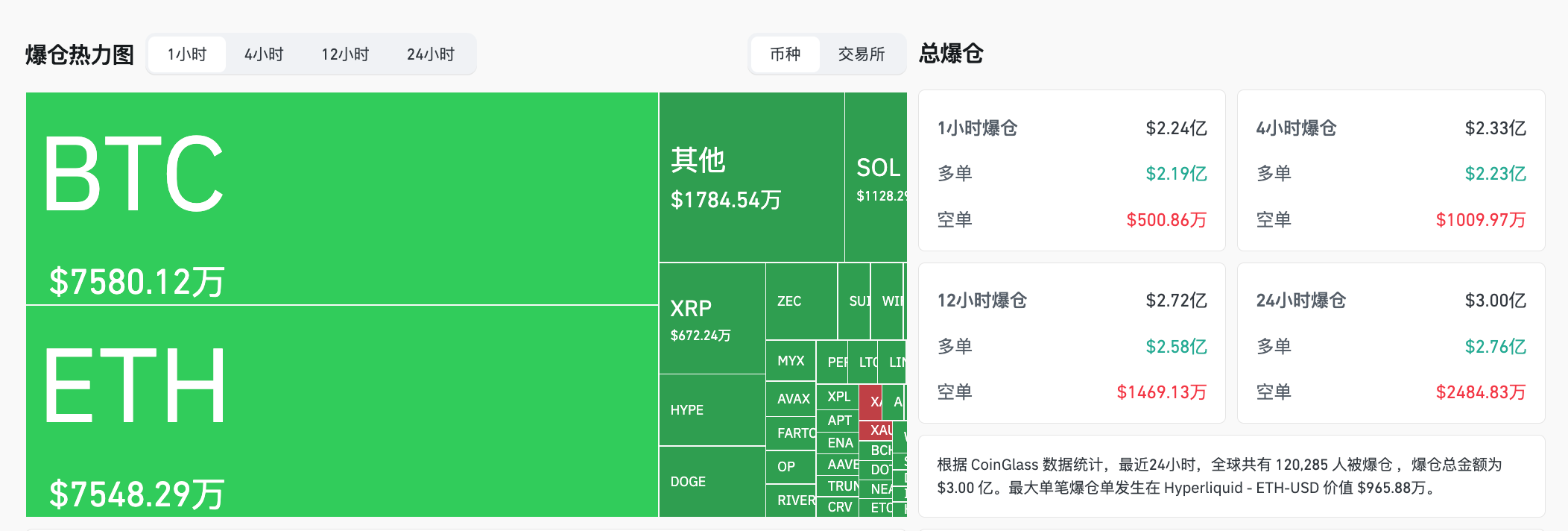 据 CoinGlass 数据显示,过去 1 小时内加密货币市场总爆仓金额达 2.24 亿美元,其中,多单爆仓 2.19 亿美元,空单爆仓 500.86 万美元。