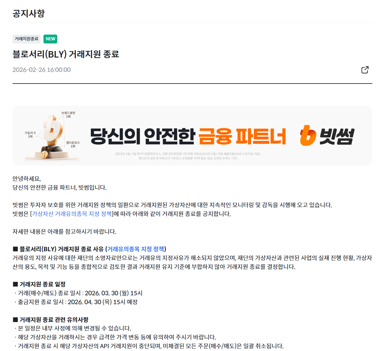 据 Bithumb 公告,Bithumb 宣布将终止对 BLY 代币的交易支持。Bithumb 在综合评估项目实际进展、代币用途及功能后,认定其不符合继续交易支持的标准。交易(买卖)将于 2026 年 3 月 30 日终止,提币支持预计于 2026 年 4 月 30 日结束。