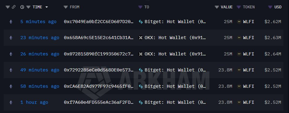 深潮 TechFlow 消息,3 月 4 日,据 Onchain Lens(@OnchainLens)监测,特朗普家族加密项目 World Liberty Financial 团队向 OKX 和 Bitget 交易所存入了 1.464 亿枚 WLFI 代币,价值约 1538 万美元。分析显示,该团队可能还将继续向交易所存入更多代币。