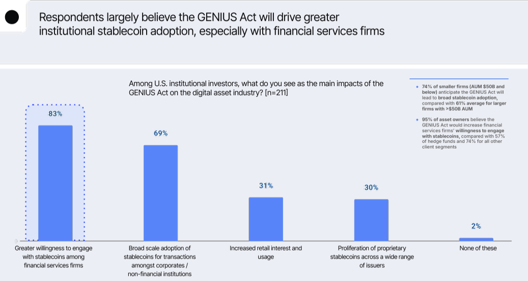 稳定币与代币化资产方面,85% 的受访者表示已使用或计划将稳定币用于支付及财务管理,83% 认为《GENIUS 法案》的通过将提升金融机构参与稳定币的意愿。此外,63% 的受访者对代币化资产持有兴趣,61% 预期代币化将对市场结构产生重大影响。