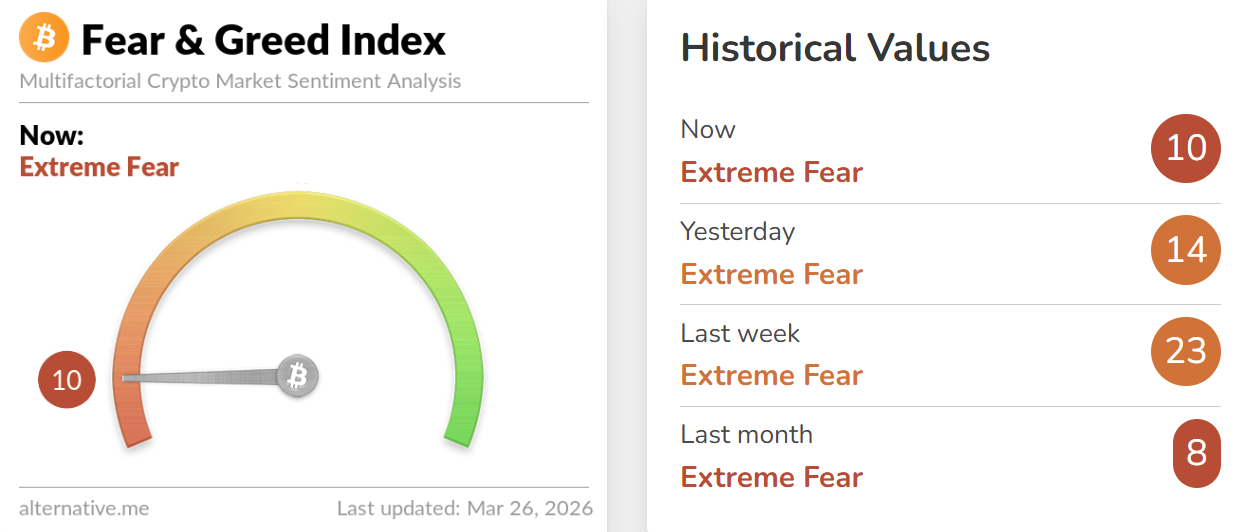 深潮 TechFlow 消息,3 月 26 日,据 Alternative.me 数据,今日加密货币恐慌与贪婪指数降至 10(昨日该指数为 14),表明市场仍处于「极度恐慌状态」。