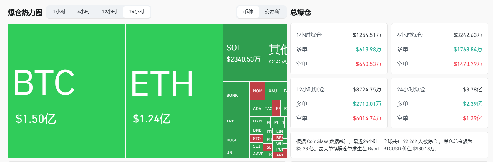 据 CoinGlass 数据,过去 24 小时内加密货币市场总爆仓金额达 3.78 亿美元,其中,多单爆仓 2.39 亿美元,空单爆仓 1.39 亿美元。 BTC 爆仓金额达 1.50 亿美元,ETH 爆仓 1.24 亿美元。过去 24 小时内共有 92,269 人被爆仓,最大单笔爆仓出现在 Bybit 的 BTC-USD 交易对上,价值 980.18 万美元。