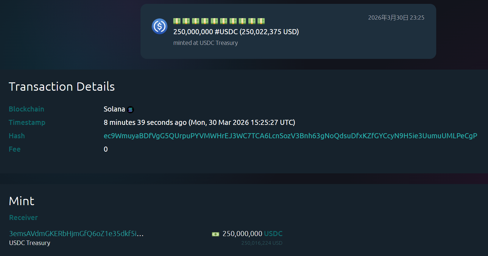 深潮 TechFlow 消息,3 月 30 日,据 Whale Alert 监测,Circle 于北京时间 23:25 于 Solana 链上新增铸造 2.5 亿枚 USDC。