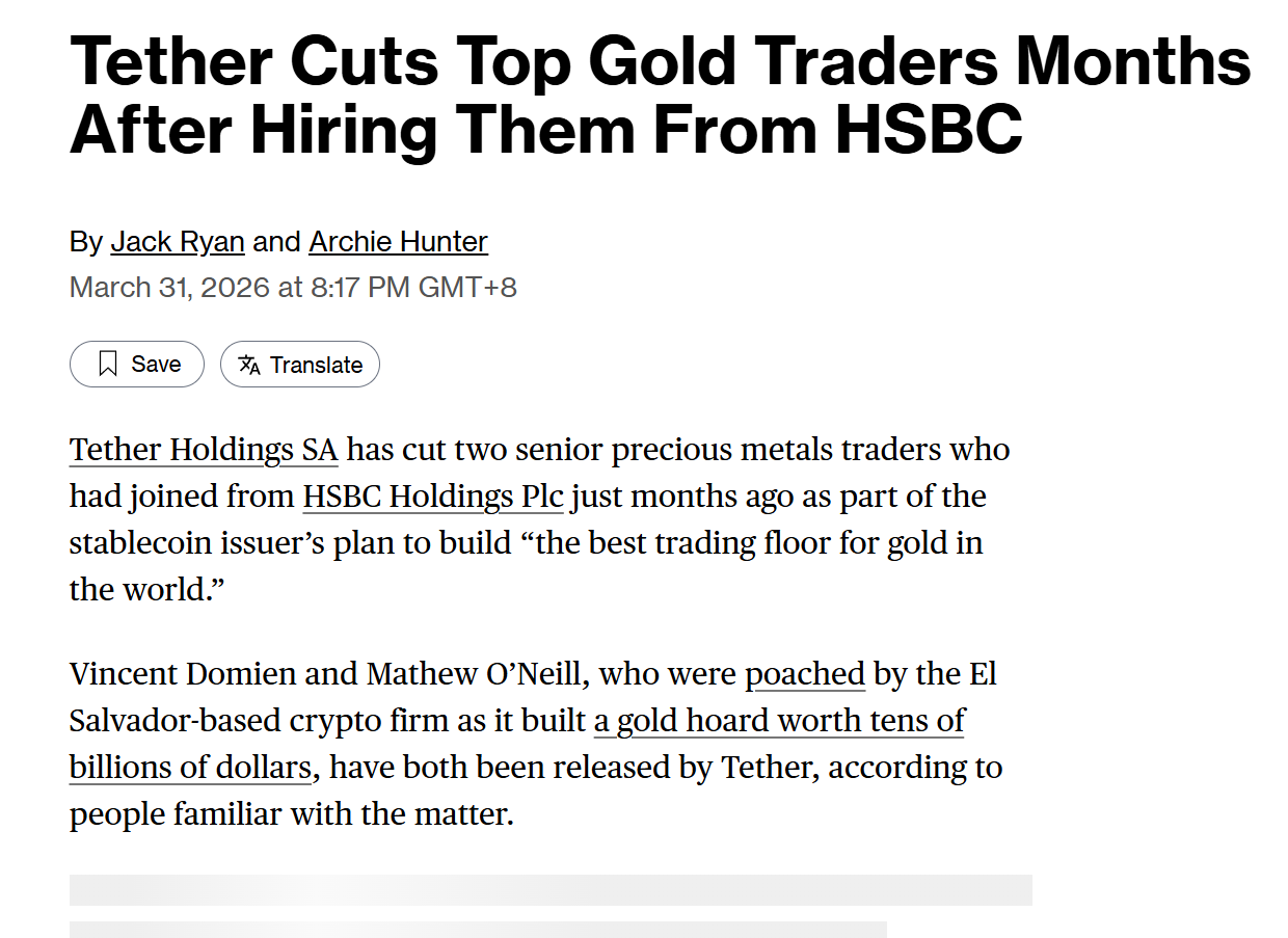 深潮 TechFlow 消息,3 月 31 日,据 Bloomberg 报道,稳定币发行商 Tether 已解雇数名顶级黄金交易员,而这些人员此前刚于数月前从汇丰银行(HSBC)被招募入职。