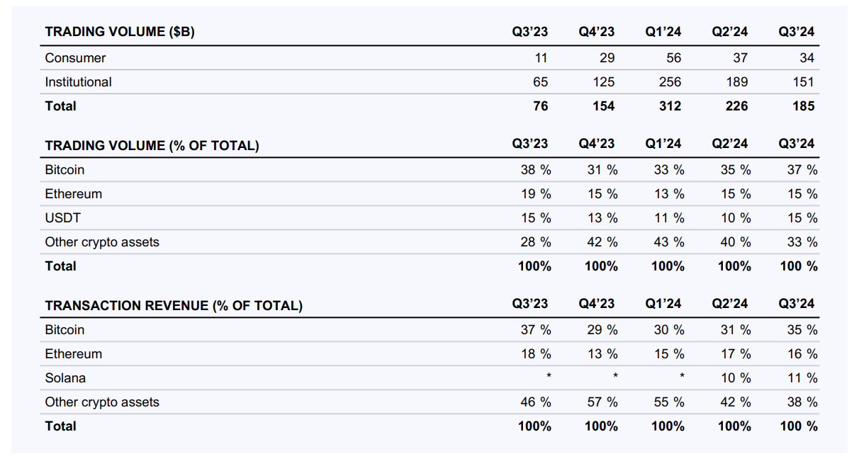 深潮 TechFlow 消息,11 月 1 日,根据 Coinbase 最新发布的 2024 年第三季度股东信中的数据显示: