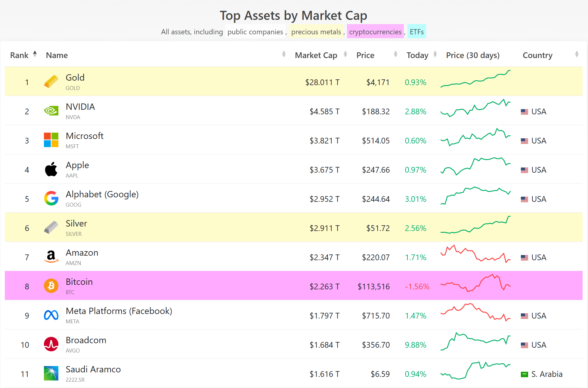 从具体数据上看,即使将英伟达(4.585万亿美元)、微软(3.821万亿美元)、苹果(3.675万亿美元)、谷歌(2.952万亿美元)、白银(2.911万亿美元)、亚马逊(2.347万亿美元)、比特币(2.263万亿美元)、Meta(1.797万亿美元)、博通(1.684万亿美元)、沙特阿美(1.616万亿美元)的市值加起来,也低于黄金总市值(28.011万亿美元)。