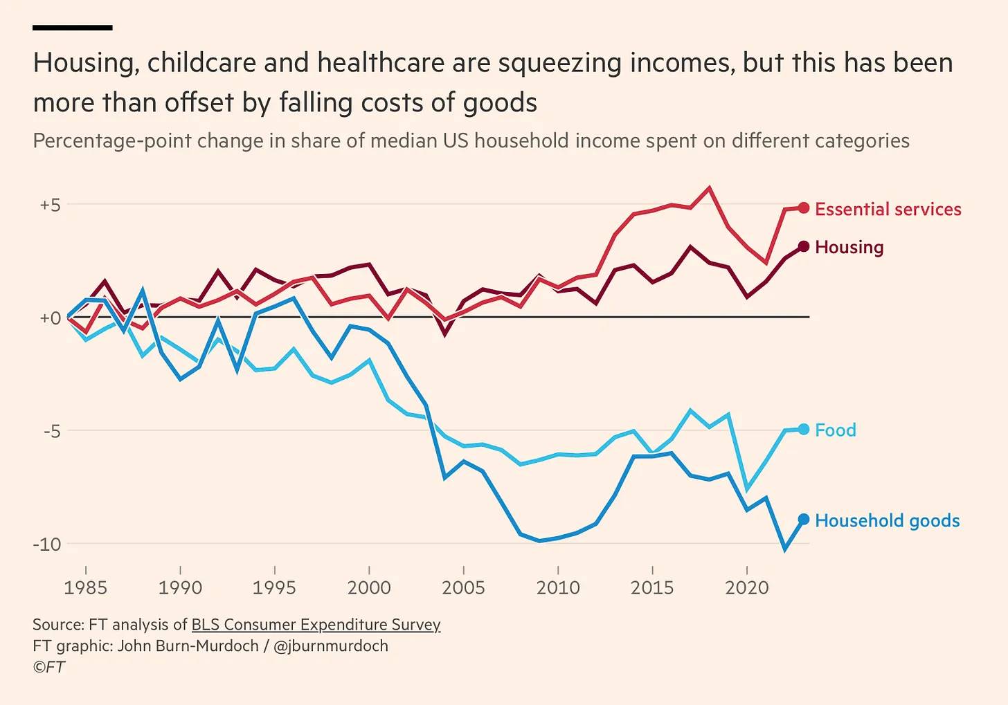 在现实中,这意味着中产阶级生活的核心要素——住房、医疗、育儿、教育、养老——全都属于鲍莫尔领域。这些领域的成本上涨速度快于工资增长速度。即便你“做得一切都对”,也可能依旧感到入不敷出。