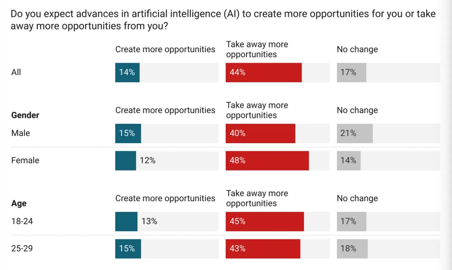 来源:哈佛青年民意调查(Harvard Youth Opinion Poll) 这或许可以部分解释,为什么近 40% 的 50 岁以上美国人认为经济“正在变好”,而大多数 18 至 49 岁的美国人却认为经济“正在变差”。这是两个截然不同的经济世界。年长者在很大程度上免受 AI 和住房冲击的影响,而年轻人则正面临这些威胁的直接冲击。