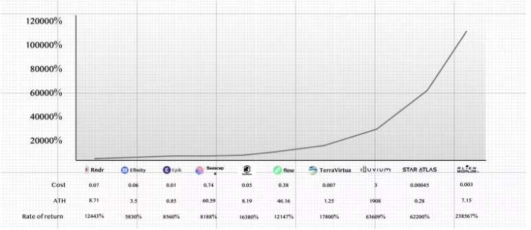 Illuvium 最高63609%账面回报;Star Atlas 最高 62200%账面回报;Alien Worlds 最高238567% 账面回报……