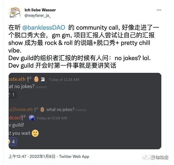 很多人都把BanklessDAO当做自己的精神家园。这句话是我截自Bankless DAO小伙伴的原话,他说“No matter what happens, or where Igo, banklessDAO was always going to be home.”这个话我不止听一个人说过,大家觉得这是我在Web3世界的原点,我在这里结识了友谊,获得了成长,这永远是我的精神家园。