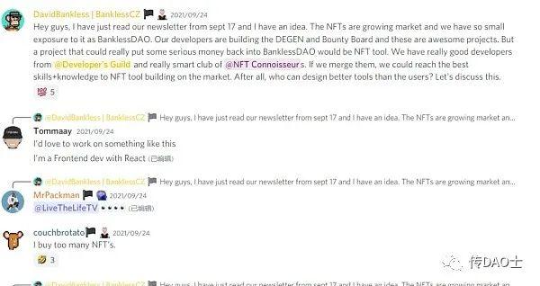 在这样的社区氛围中,你可以清楚地感受到术业有专攻,治理是每个人的责任,即使你没有专长,也可以成为工会的记录员,运营者。并且成员归属感非常强烈,不管你持有的token多少,甚至你分文没有只是进来打个酱油,你在频道中的发言都是被尊重的,你作为贡献者你是有话语权和影响力的,在这里可以实现扁平化“创造性工作”,Bankless DAO的氛围也是员工情感催化剂,促进了社区成员为爱发电,在线上班。
