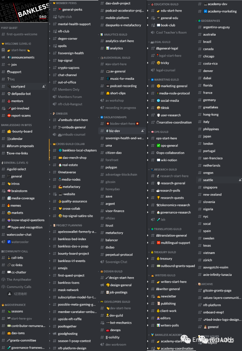 如果跑去BanklessDAO的discord里看,进入的第一分钟大概就会崩溃,里面竟然有200多个看起来杂乱又千奇百怪的频道。
