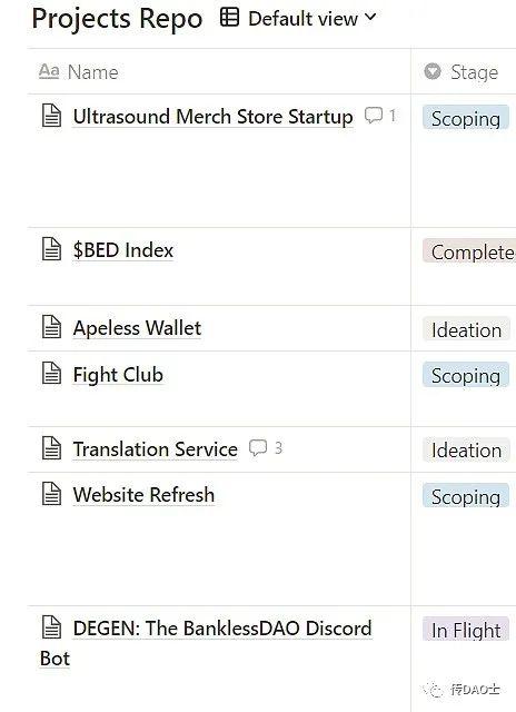之前提到的项目,很多贡献者都在用项目和任务来建设BanklessDAO。