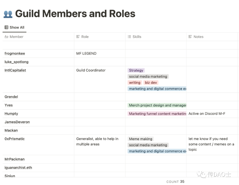 而对于希望参与到工会运营和项目协作的成员,则一般还会把自己的名字,能力等情况更新进工会的Notion页面,以便进行协作。