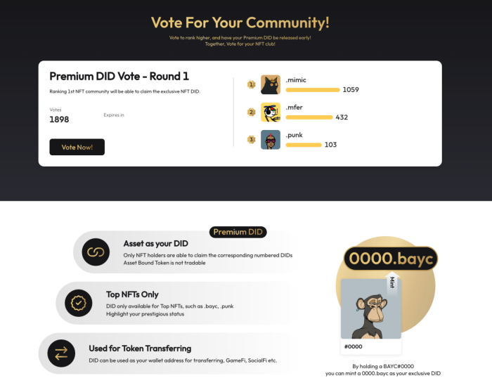第二轮投票将于12月8日20:00(UTC+8)开始,并将在前期投票数得基础上继续累加投票。目前票数领先的是.mfer、.punk、.doodle,但尚未拉开差距。持有相应NFT以及.did域名的均可投票,上一轮投过票的用户可以在新一轮中继续投票。