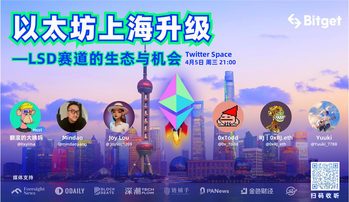 Bitget在上周以“以太坊上海升级—LSD赛道的生态与机会”为主题在Twitter Space开展了一场线上话题访谈。本期访谈由翻滚的大姨妈担任主持,并有幸邀请到了Mindao、Joy Lou 、0xTodd、0xRJ.eth、Yuuki五位行业内专业的嘉宾来做话题的讨论分享。