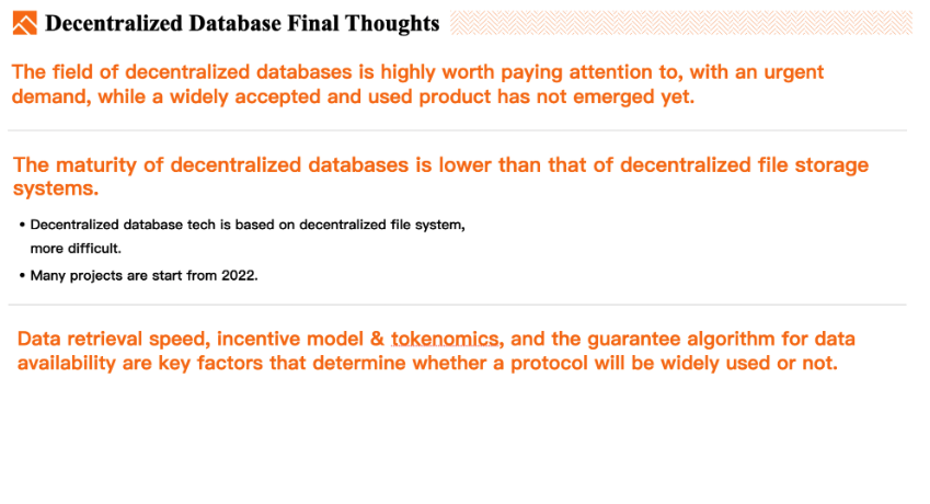 • 去中心化数据库技术的成熟度低于去中心化文件存储系统。因为去中心化数据库技术是基于分布式文件系统的。许多项目是在2022年启动的。
